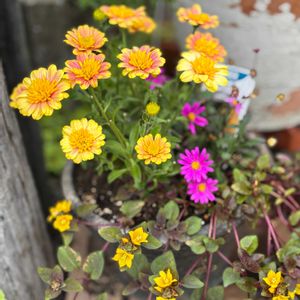 ユーカリ🌈 今日のお花💐 皆さんの投稿で「今日のお花」と知って慌てて🤳 寄せ植えにしてましたが、大きくなり植え替え、株分けしたリシマキアと一緒に🌼 リシマキアは先日の風雨でお花は散り✂️