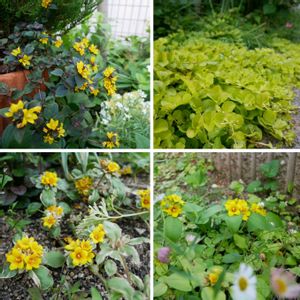 いくつかのパンジービオラの鉢から撤収してきて まとめて放り込んだリシマキア ペルシアンチョコレートにお花が咲きました💛 大量のコレ、今後どうすれば?
