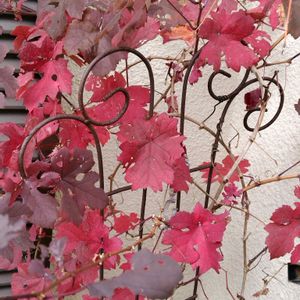 こんにちわ。今日の花はブドウ。 うちにはヨーロッパブドウプルプレアがあります。銅葉がきれいで、今の時期はこんな赤茶になってます。 でも残念ながらこれまで実も花も影すらみたことない(+o+)お隣さんとの境に目隠し替わりにオベリスクに仕立ててるので、少しでもそちら側に伸びると容赦なく切ってるから、たぶん自由に伸ばせれたら実もつくんだろうなあ。あとやっぱり銅葉は背景白のほうが断然映えますよね。