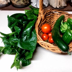 裏庭ポタジェ💠今朝の収穫 ピーマン初収穫🎵 毎年ピーマンとは相性🙆なんだな これからピーマン祭りが始まる~🎶 トマトはうまく育てられない上に 日々カラスとの戦い でも糖度高くて美味しい😆👌❤️ 小篭にいっぱい採れるのが夢 キュウリはこれで30本目 一日置きに2、3本 このペースが核家族にはちょうどいい その他 ナス、ハーブ類、モロヘイヤなんかが 食卓を潤してくれてます うまくいったり いかなかったり でも楽しいからやめられない もう来年のことを考えてるw