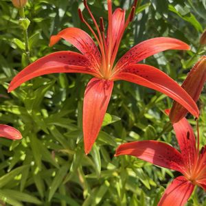🧡スカシユリ(透百合) 鮮やかなオレンジ色で、オニユリとは違って上向きに咲きます。日本の海岸の岩場に咲きます。 ⚫︎ユリ科 ユリ属 ⚫︎原産 日本 ⚫︎花期 7月〜8月