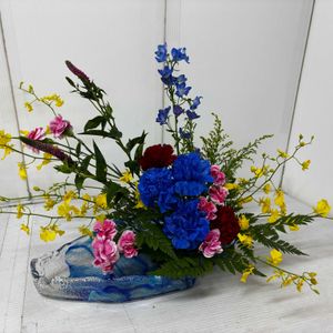 生け花 木組との調和を生かしたデザイン 木は3本もクロスし、自立で立てるような状態にし、合わせて花を生けてみました💐