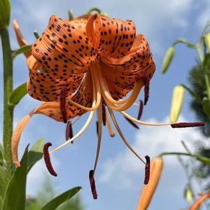 👹オニユリ(鬼百合) 夏になると咲き出すオレンジ色に黒点の大きな花です。オニユリにはムカゴが付き、コオニユリにはムカゴができません。 ⚫︎ユリ科 ユリ属 ⚫︎原産 日本 ⚫︎花期 7月〜8月