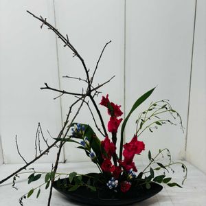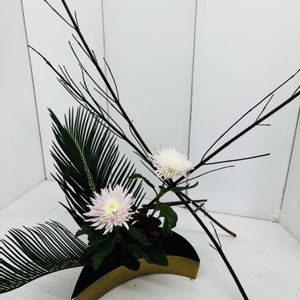 木組み 枝物をアートの作品のように花とのコラボレーションを構図に入れたテーマ なかなか枝を立てることができず、苦戦… その後のお花は、イメージ通りに行生けられたと思います✨💐