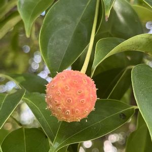 🔴ヤマボウシの実 小花が集まって一つの実になっているので表面にボコボコした突起があります。 マンゴーに似た甘くトロピカルな香りとシャリシャリした食感で、生で食べられるほか、ジャムや果実酒に加工されます。 ⚫︎ミズキ科 ミズキ属 ⚫︎原産 日本 ⚫︎花期 5月〜7月 ⚫︎果期 9月〜10月