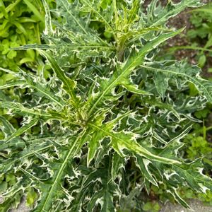 今日の花 アザミ 我が家の斑入りアザミは葉っぱだけスクスクと成長中 白アザミは種になりました〜こぼれ種でふえるかのかな?