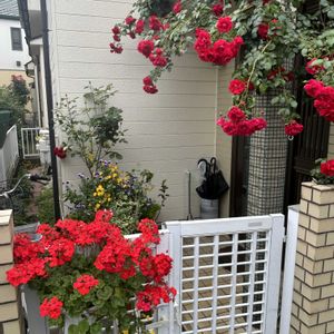 家の玄関に伸ばしたばら、トラデションが満開になってきました。門扉に掛けたゼラニウムや奥のばら、イングリッドバーグマンや赤いハイビスカスと併せて、小さなレッドガーデンてなっています。