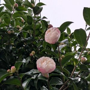 こんにちは。◕‿◕。 山茶花の花が咲き始めました。 今年は蕾がいっぱい、綺麗でうれしいけれど、花びらの掃除🧹が大変だぁ🤭