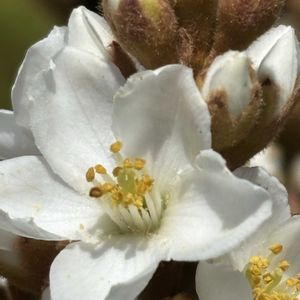 シャリンバイ かなり広いスーパーの駐車場の周りの生垣に植栽されていました 白い色がよく目立ちました 近づいてみると可愛い白い花です バラ科 シャリンバイ属 常緑低木 原産地 日本 東アジア 車輪状に出る葉と花序のひとつひとつの花が梅に似ていることからこの名が付きました 秋にブルーベリーに似た黒紫の実を付けます 食べられるけどブルーベリーのようなジューシーさがないので食用には不向きなようです 時々鳥が食べに来るようです 大気汚染や潮害にも強いので高速道路や海岸に近い公園などにも植栽されているようです 花言葉は「そよ風の心地よさ」「愛の告白」「純真」 「そよ風の心地よさ」はこの季節にぴったりですね まさに今日のようです 暑かったけれど風が吹いていて爽やかです シャリンバイは真っ白な花なので「純真」もぴったりですね♪ 「愛の告白」はどうでしょう?香りもかすかにあるので花束にして思いを告げるのはいかがですか? yoyoさんの🏷️木曜日は木に参加します