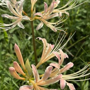 暑い中、ちょこっと散歩 ①リコリス、草むらで咲いていました ②1cm位の小さなマメアサガオ、可愛いです ③道路脇のシャリンバイ、色付いてきました ④美しい百日草、まだまだ元気です