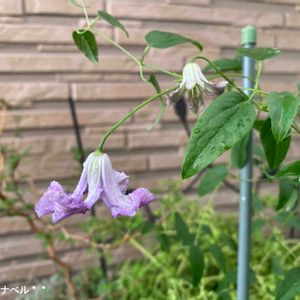 クレマチス𑁍ベティコーニング 細い枝が一本しか出なかったのでトレリスも立てず 支柱に絡ませただけにしてしまったが あれ?割と花数多く咲いてきている