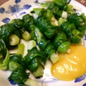 熊本の郷土料理 ひともじのぐるぐる(@_@) 茹でてぐるぐると巻くだけ。 適当なので巻き方ヒドイw 子供の頃 酢味噌でたくさん食べさせられました。 ひともじ(一文字)はネギの別名 ここでのネギはワケギみたいなものです。 ちなみにニラは別名フタモジ(二文字)なんだそうです☺️