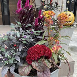 今日の花 ❇︎ケイトウ❇︎ 玄関前ハロウィン仕様の寄せ植え 今年はケイトウと唐辛子 ケイトウの花良い感じです♡ 👻Happy Halloween🎃