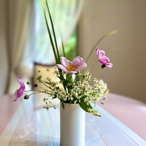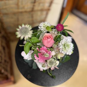 ピンクの花のアレンジ バラ(ヴィクトリアン)・ガーベラ(ボレロディヴィディヴィ)・千日紅・アストランティア・アルストロメリア(ファンファーレ)・シンフォリカルポス(白い実)・ユーカリ(ポポラス)・利休草 野に咲く花を摘んだように〜💐 自然にこんな風に集まって咲くことはないけれど〜🤣 想うのは自由〜〜🗽 by ぎんねこ −お花のレッスンにて− 「写り込む 電子蚊取り器 秋の部屋」 銀猫女 (5枚目‥後で気づきました^_^ 自宅も扇風機片付けないと‥)