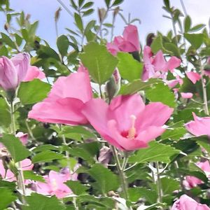 ムクゲ(槿) ご近所のお花散歩をしていたら、 遠目に濃いピンクのお花いっぱいの木が! 何だろうと近づくとピンク色のムクゲ〜** *⑅🩷☽︎︎.*·̩͙** *⑅🩷☽︎︎.*·̩͙** *⑅🩷☽︎︎.*·̩͙** *⑅🩷☽︎︎.*·̩͙ この辺りで見かけるムクゲは、白花やヒノマルがほとんどなので、うれしいびっくりでした🫢 夏から秋、酷暑の中でも次々と花を咲かせてくれるよく似たムクゲとフヨウは同じフヨウ属の仲間で、 「フヨウ属=(学名)ハイビスカス」なんですねー、知りませんでした‼️ 🏷️知りませんでした仲間 【追記】 一枚目は、ピンボケpicを選んでしまってたことに、投稿した後で気づきました。スミマセン〜 (複数枚の投稿写真から1枚削除できる機能があったらしたいところデス💦)