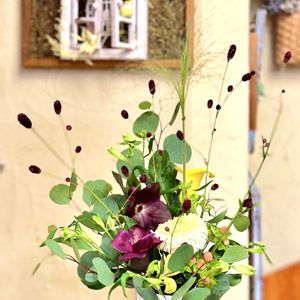 秋色のアレンジ ワレモコウ(吾亦紅)・ダリア・クリスマスローズ・ ヒペリカム・カラー・ユーカリ(ポポラス) すっかり寒くなり、今日からファンヒーターを入れました。 北国生まれの家族は、暖房がしっかり効いてる室内が当たり前で育ったせいか、暖房が手薄だった南国生まれのわたしより、毎年ずっと早く暖房体制をスタートさせます🤣🤣🤣