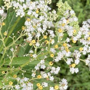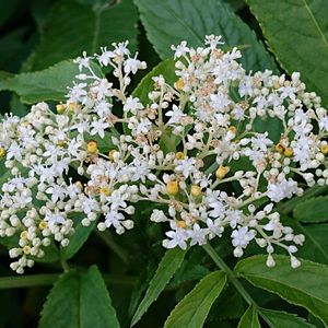 ソクズ(蒴藋) スイカズラ科ニワトコ属 別名…クサニワトコ.草接骨木 分布…本州以南 花期…7~8月 草丈…1~2㍍ お花の大きさ…5㍉程 所々にある黄色いのは 腺体🟡 密は甘いんでしょうね🐜😋 溜め池のある斜面に 葛と一緒に旺盛に 繁っていました🌿