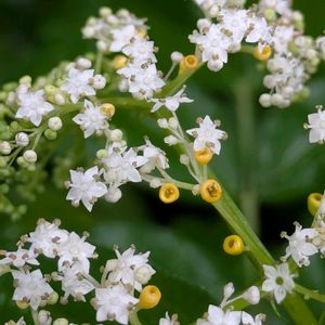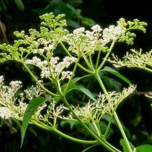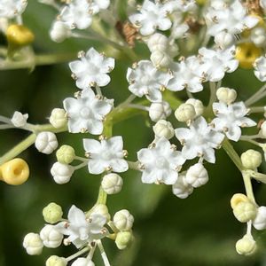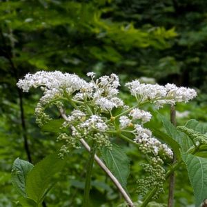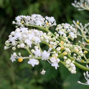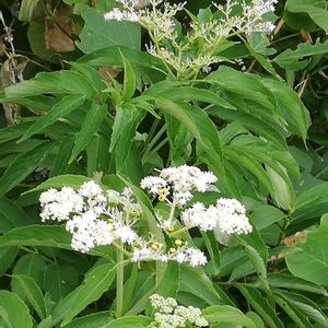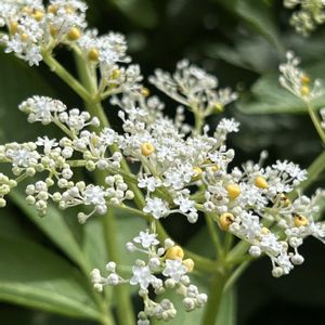 ソクズ レンプクソウ科ニワトコ属 多年草 本州、四国、九州に分布 山地や山野の林縁、道端、人家の付近に生育する。 木のように見える大型の多年草である。 地下茎を這わして繁殖する。 茎は直立して、高さ1〜2mほどになる。 茎の先端に大型の散房状集散花序をつけ、小さい花を丸い平板状に集めて多数付ける。 花冠は白色で、径3〜4mmになり5裂する。 雄しべは5個で、花序の中に蜜を貯める壺状の黄色い腺体がある。 果実は径4mmの球形となり、赤色に熟す。 花期7〜9月 🏷️白い水曜日♡ に参加させていただきます。