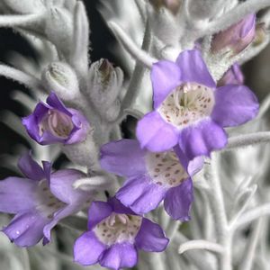 鉢植えの中エレモフィラ ニベアが咲きました シルバーリーフに、薄紫の花が幻想的です💟 ⑤孫のペットクレヨン君はネモフィラのお花見