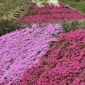 芝桜の富士山と本物の富士山、そして逆さ富士 本物の富士山を背景に,逆さ富士も見えました (2025.4.22 10;22〜小山町北郷地区より)