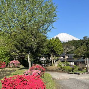 今朝の富士山とツツジたち、田んぼの逆さ富士 (2025.4.30 7:19〜御殿場市小倉野より)