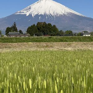 昨日と今朝の雪化粧の富士山と麦畑 五月もよろしくお願いします (2025.5.1 6:26〜御殿場市深沢より)