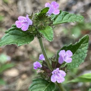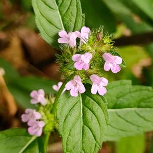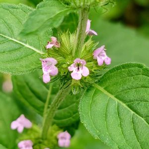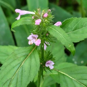 クルマバナ(車花) シソ科トウバナ属の多年草 和名の由来は花が数段の仮輪に輪生することから。 葉脈の深さ、仮輪の大きさや毛の量など変化が多い。 低地~低山の里山の日当たり良い湿った草地に生育する多年草。 茎は4稜あり、高さ20~80cm、まばらに下向きの毛が生える。 葉は卵形~狭卵形、長さ2~4cm、幅1~2.5cm、鋭頭鈍端、鋸歯があり、基部は円く、5~15mmの葉柄がある。 小苞は線形で長さ5~8mm、開出する長毛がある。萼は長さ6~8mm、紅紫色を帯びることが多く、開出毛がある。 花冠は長さ6~10mmで淡紅色~紅紫色。分果は平滑で長さ約1mm。