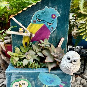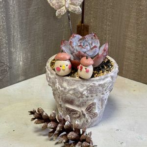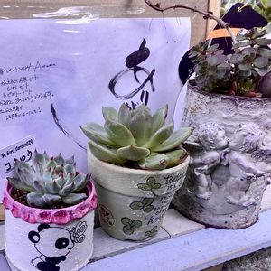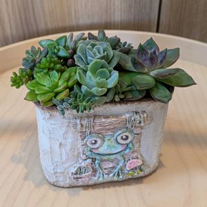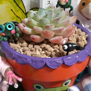 fukumomoさんの輪ッしょい〜〜 カエルモルタルセットに さきゅまるさんのお弁当で早速寄せ植え〜〜1番大きなコはブラウンノワールなんですねぇ〜〜一緒に入れちゃったけど、可愛い名札がついていました〜〜♥ このカエルちゃんの鉢、めっちゃ魅力的〜〜😋ずーっとお顔を観てても飽きません〜〜fukumomoさんの愛情パワーだなぁ〜〜色のだし方がこんなふうに出せたらだし、細かいところまで丁寧なんですよねぇ〜 しまった!!カエルちゃん🐸編みぐるみ一緒にパシャしてあげるの忘れてしまった〜〜あのコも赤いほっぺが可愛いです♥ あははは〜〜 比べるのもなんですが、私のモルタル作品の寄せ植えを手直ししたんで、ここに一緒に載せちゃおう〜〜