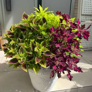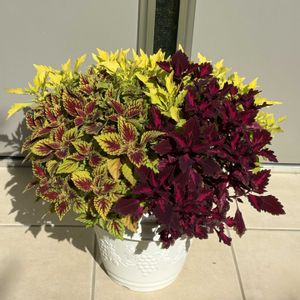 こんばんは😊 ハルディンさんのコリウス が綺麗です✨ 口笛ピッピ イエロービーム ロイヤリティ 3株を260型の鉢に植えてます🪴 大きくなってきたらカットするだけ ずっと雨ざらし 朝晩だいぶ冷えるようになってきたから そろそろ終わりなのが惜しいけど… でもね その場所は空けて欲しいの… 次の子が待ってるから😆 また来年も絶対にコリウスお迎えするぞー❣️