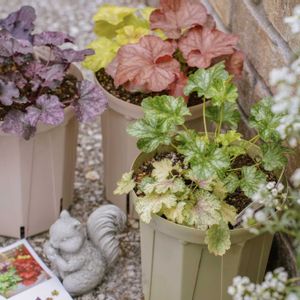 春から育て始めたヒューケラがいい感じになってきました!夏の暑さで枯れかかった子もいましたがどうにか復活してフサフサに😊左下は最近お迎えした新人さんです👍地植えに憧れますが、庭は極狭な上にコンクリートなので、鉢植えで楽しんでいます!