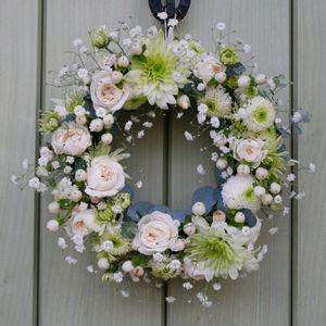 今年のリースは白を基調にしました。 2種のマム、バラ、ヒペリカム、かすみ草、 シルバーが綺麗なユーカリグーニーはマムの花束についてたものです。 気分はホワイトクリスマス?