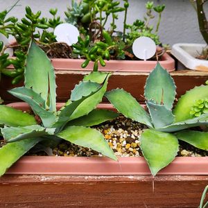 すいません、お蔵入りになりそうなので、もう一枚いいですか🙇💦 私の初めての種からの実生アガベさんです😊 覚えていらっしゃる方、居るかなぁ~🙄💦 20粒の種を撒いて2年?3年?経ち、現在10数株生存中。 そんなに沢山、生存するとは思って居なかったので、撒きすぎてしまった😅と少し後悔もありますが💦 もう、多すぎなのでプランター植え作戦に切り替えました🤣🤣🤣