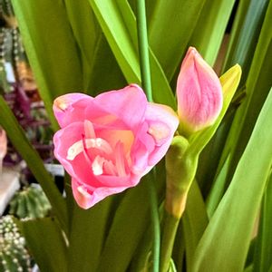 こんばんは🤗 今年は 咲いてくれました♪ 球根は増えるのですが なかなか咲かないのです。 可愛らしい🩷色ですよ🎵