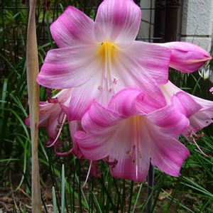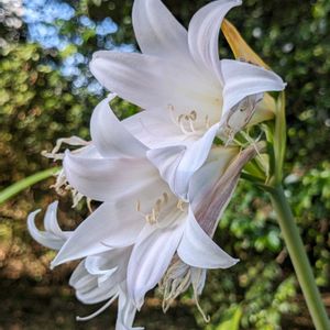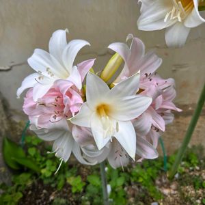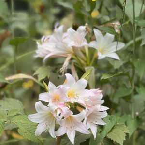 ベラドンナリリー フェイバリット 初開花です!フェイバリットは三宅花卉園さんが切り花生産していますが、球根の販売はほとんど無いので貴重です! 咲き始めは写真2枚目のように白色ですが、数日経過するとピンク色に変化します。開花の時間差によって2色咲きになるので非常に美しいです😍😍 今年は3枚目のようにいくつか蕾同士が癒着して八重咲きっぽくなっていました。恐らく一過性のもので固定しないと思います。