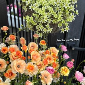 💚🤍クレマチス ペトリエイ🤍💚 🧡🤍ラナンキュラスラックス ベスタリス🤍🧡 2枚目 門扉にかけた💚クレマチスが満開になり、うっすらグリーンが美しい✨ 3枚目 その下に置いている鉢の🧡ラナンキュラスラックスも満開✨✨ 朝から癒されています💓 今朝は冷んやりしていますが、爽やかな気候😊 お花見🌸も堪能できますね 皆さま、よい一日をお過ごしください💕