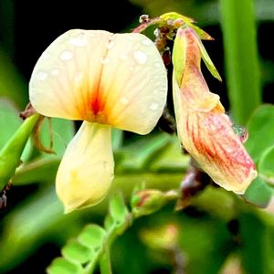 クサネム いかにもマメ科でございますという顔をして、わっさわっさと育っている🟡 旗弁の基部に橙赤色の班があるけれど、後ろからみても筋が目立つ🔶 細長い豆も出来始めていて、まだ先に花弁の名残がついています(,,>᎑<,,) 偶数羽状複葉の小葉は、触ったり、夕方になると閉じる就眠運動をするのが名前の由来(^_-)