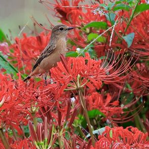 ノビタキと草花 ①ヒガンバナ ②クサネム ③ノゲイトウ