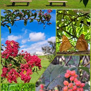 筑後広域公園(福岡)にて 2025年10月5日 空はまだ夏空 樹木や花・・・秋の気配 ➊✿サルスベリ ✿ガマズミの実 ✿ヒガンバナ 🦋コムラサキ ♂♀ 雄の表翅は光の具合で紫色に。 ❷✿アキノノゲシ ✿イシミカワ やっと色付き始めた ➌✿クサネム 花 ✿ 〃 実 🦋タテハモドキ(秋型) 裏翅はまるで枯れ葉。 ❹✿ジュズダマ ❺✿高嶺ルビー もうソロソロ咲き始めると。 ✿ヒガンバナ