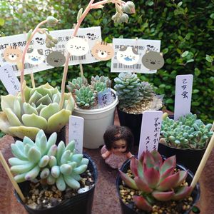 ふじさんめっせで開催された「つぶ・タネ多肉祭り ふじさんdeワッショイ」参加して来ました😆 大好きな多肉YouTuberのお2人がまさかまさかの地元で販売会をされると聞いて、いてもたってもいられず人生で初めての多肉販売会へ… 会場に着いたらおっきなMyカゴ持った百戦錬磨であろうミナサマに圧倒され、欲しかったピンセットは完売で買えず、肝心の苗も大本命の「さくらもち」は見つけ出すコトすら叶わず惨敗でしたが、ミソップさんに差し入れ渡せてヨカッタ😊 みんなあの中でどうやって欲しい苗を探し出してるの…❓😰 抽選で「ももホイップ」当たった人が羨ましい〜😍 (当選番号ニアミスしてた〜😂) 2番目に欲しかった「小梅」と、目が合った「ざらめ」をお迎えしました☺️ ミソ苗は交配式見るヒマすらなかったヨ…😂 2枚目:見本苗の小梅ちゃん。そうそう、この色合いがめっちゃ可愛くて欲しかったんです❣ 3枚目:ミソップさんの動画のOPでいつも並んでるローラさん、実物拝めて嬉しい😍この鉢もめっちゃカワイイので欲しいなぁといつも思ってます😚 参加されてた人は多数(1グループ120人くらい❓)でしたが、殺気立った奪い合いは全くなく、鈍臭い私でも楽しかったです。 また参加したいな😃