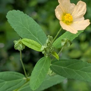 散歩道端に毎年咲きます。✨ 時間を気にしていかないと可愛いお花(1.5センチ位)に会えません😁 (お昼前後に開き2〜3時間で閉じてしまいます😥) キンゴジカ(金後時花) アオイ科 キンゴジカ属 熱帯アメリカ原産 関東以西に帰化