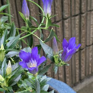 猛暑の間 日陰にずっとあったので細く伸びきったリンドウ(竜胆)が3段支柱リングに支えられて咲き始めました✨ 花は晴天の時だけ開きます。 リンドウ科 リンドウ属 花期 9〜11月