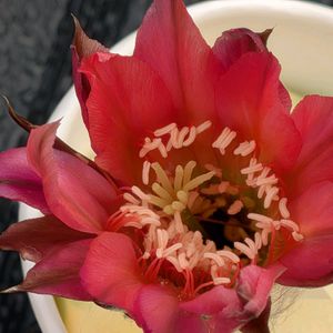 おはようございます やっちゃいました。゚(゚´Д`゚)゚。 お迎えして数年、初めての開花をまってたのに なんと(●`ε´●) 花茎折ってしまいました 。゚(゚´Д`゚)゚。 自分の不注意 バカバカバカ とりあえず紙コップに水挿しておいたら 何ていうことでしょう⁉️ 中途半端やけど 咲いてくれた〜✨️✨️✨️(≧∇≦)b すごく濃い黒みかかった赤 キチンと咲かせてあげたかったな〜 蕾なし… 秋にまたす、咲いてくるはないかしら