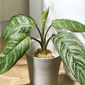 細葉が美しいアグラオネマ•ホワイトバンブー😍 親株から子株が五つも出てきました🌱🌱🌱🌱🌱 しかも葉っぱの柄が親株とは違って矢羽根模様になっています😱 まるで二種類のアグラオネマを寄せ植えしたかのようになってますが🍀☘️成長したら葉模様は変わるのでしょうか🤔