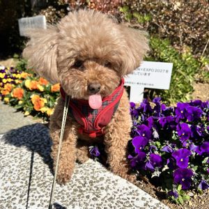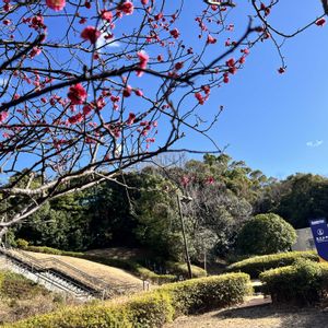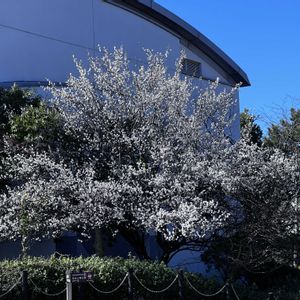 マロン🐨のお散歩中、駅前で観梅。 マロンの頭に梅の花🌺
