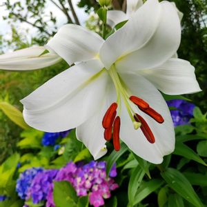 今日も暑いです。雨上がり?だからやや涼しいけど。メルカリで買った謎百合、2パターン目が咲きました。カサブランカに似てるけど、内側がツルツルなのと香りが少ないのでカサブランカではないですね。こちらの方が先に咲いた子より白いです。よく増えたとの事で、多分OTハイブリッドのザンベジかな。 玄関前ではペニセタム マクロウルム(テールフェザーズ)がキレイな穂を上げ始めました。 春に花を咲かせるタイプ以外では一番乗りです。初めて穂がついたのですが、1mくらいの高さでホワホワしているので、ちょうどいいフォーカルポイントになってくれますね。 ブッドレアはどんどん咲いています。花が半分以上終わったらカットしてポイしてるのですが、下の芽にどんどん新しい蕾ができてどんどん咲いていきます。新しい花茎は伸びますが、元の枝は花が咲き始めるとあまり伸びないので、花がらをカットしながら切り下げていくと、だんだんコンパクトになって行って、冬にはバッサリ剪定。今の時期が一番大きい状態です。