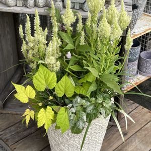 今日は、新宿のグリーンギャラリーガーデンズの寄せ植えワークショップで、寄せ植えを作りました〜🤗 白い鉢に合わせて、グリーンとパープル系がいいかな、先生の渋谷さんが作られるような寄せ植えを作りたいな、とグリーンのセロシア中心に💚 爽やかな色合いだけど、秋らしいひと鉢に仕上がって、大満足です🪴✨ 1️⃣出来上がり❣️お店の素敵な一角で記念撮影〜📷✨ 2️⃣さぁ、これから植えるよー🧤 3️⃣お家に持って帰りました😊 4️⃣ヤブランの株分け、絡まって難し過ぎて、先生の手をかなりお借りしました🙇♀️ お花もだけど、グラデの葉っぱがとってもきれい✨ 5️⃣後ろにはシジムラサキをあしらって。 改めて、寄せ植えのテクニックや葉組みのしかたなども教えていただき、とても勉強になったし、おしゃべりも楽しくて、あっという間の時間でした〜☺💕 本当にありがとうございました♪