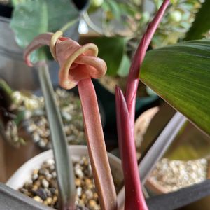 2025.4.17 謎フィロ サンレッド?にしては新芽の色が黒い🧐みなさまは何だと思います? いつものスーパー併設花屋さんの片隅にひっそり置かれてるのを目敏く発見💡👀 店頭にはプリンスオブオレンジがなかなかのお値段で並んでいる横でこの子だけが半値でしかも商品タグ🏷️はただのフィロデンドロン お店の方曰く、品種名謎なのでお安くしてまーす❣️株はいいのでお買い得ですよ😙と八百屋さんみたいなセールストークに乗せられて😆まんまとお持ち帰り🛒 苦手のフィロデンドロン、今年こそは上手く育てられるように頑張る💪