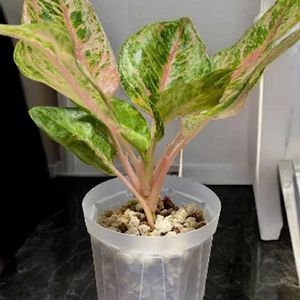 葉模様が美しく、主脈はうすピンク色をしているアグラオネマ•ピンクバタフライ🩷💚 茎もうすピンク色💕😍 スマホでは実際の色味が出ないのが残念です😢