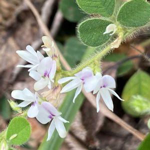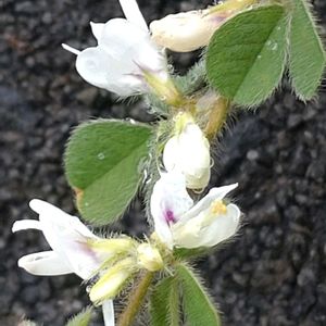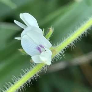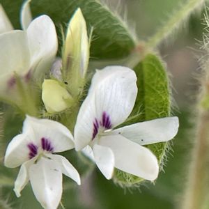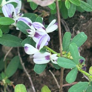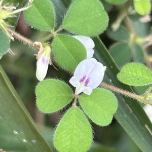 今日のお花❷ ネコハギ(猫萩) *マメ科ハギ属 花期は9〜10月 本州〜九州の日当たりの良い乾いた草地や道端で見られる多年草! 地表を這い長さ1mほどまでになり、全体に柔らかい毛が多い! 葉は互生し、楕円形〜ほぼ円形の三出複葉! 白い花は葉腋から2〜4個まとめて付く蝶形花で、旗弁の根元に紅紫色の模様が入る! ⑤ 凸レンズ状の果実! 名前の由来は、葉や茎に全体的に生えている柔らかい毛を猫の毛にたとえたもの! 9月21日撮影 宮城県 多賀城市