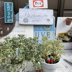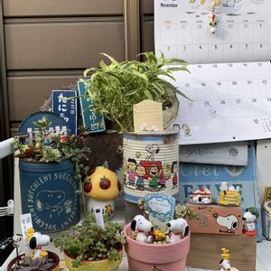 こんばんは🌙.*·̩͙.。★*゚(ᴗ͈ˬᴗ͈❀) 1枚目 🏷毎月2日はスヌーピーの日 🏷カレンダーの日 🏷2の付く日は斑入りの日 なばなの里のマルシェでステンシルと寄せ植えしたリメ缶や、さくら餅子ちゃんから頂いたスヌーピーリメ缶の多肉がもりもりに成長して 南十字星から花芽が出たり、リトルミッシーも垂れ下がってきています 来週には梅雨入り予想のニュース📺見ましたのでそろそろ切りそろえないとですね💦 2枚目 今日は 🏷ピータンの日 でもあるので1枚目の(●)´`・)♡さんに加わって賑やかに😁 スヌさんリメ缶にきのこ🍄ピック 挿してたのですが💦 多肉が育ってきて持ち上げないと見えない( ⌯᷄௰⌯᷅ )😅 そこにキノピータンに来てもらったよ〜 少しは分かる?!かな〜 3枚目 先日、KOH fellowちゃん⋆꙳𝜗𝜚꙳.*に オーダーした オヤジおぼうぼピータン鉢とオジゾータン鉢、イシコロタン鉢が届きました🎁✨ プレ企画で頂いたのがウエルカムボードだったので、リメ鉢を直に見て 手にするのが初めてでして めちゃくちゃ綺麗で可愛いリメ鉢に 鳥肌立って、キュンキュン😍です 早く投稿したくて とりあえず植えたい多肉候補を 仮に入れてみました😊 やっぱりつぶつぶ多肉や、斑入り多肉が良いかなー🥰 4枚目 🏷2の付く日は斑入りの日 45ちゃんから分けてもらった 鏡花、少しずつですが増えてきたんですが最近なにかに食べらた跡が💦 今朝見た時、黒い🐛発見‼️ よく見ると分かりますが苦手な方は 拡大⚠️注意⚠️です 早々に退去してもらいました😤 5枚目 🏷2の付く日は斑入りの日 めちゃくちゃ地味😅ですが 斑入りユキヤナギ、花が終わり 種が出来てたので試しに蒔いてみたら、芽が出てました よく見たらちゃんと斑入りの葉が💕 🏷斑入り見つけ隊♪ 付けさせて貰いました😊